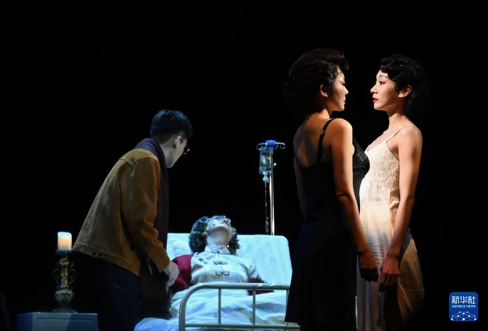 1月1日,孟庆旸、许晴、徐俐、张翰(从右至左)在《如梦之梦》中分别饰演青年顾香兰、盛年顾香兰、老年顾香兰和五号病人。新华社记者 金良快 摄